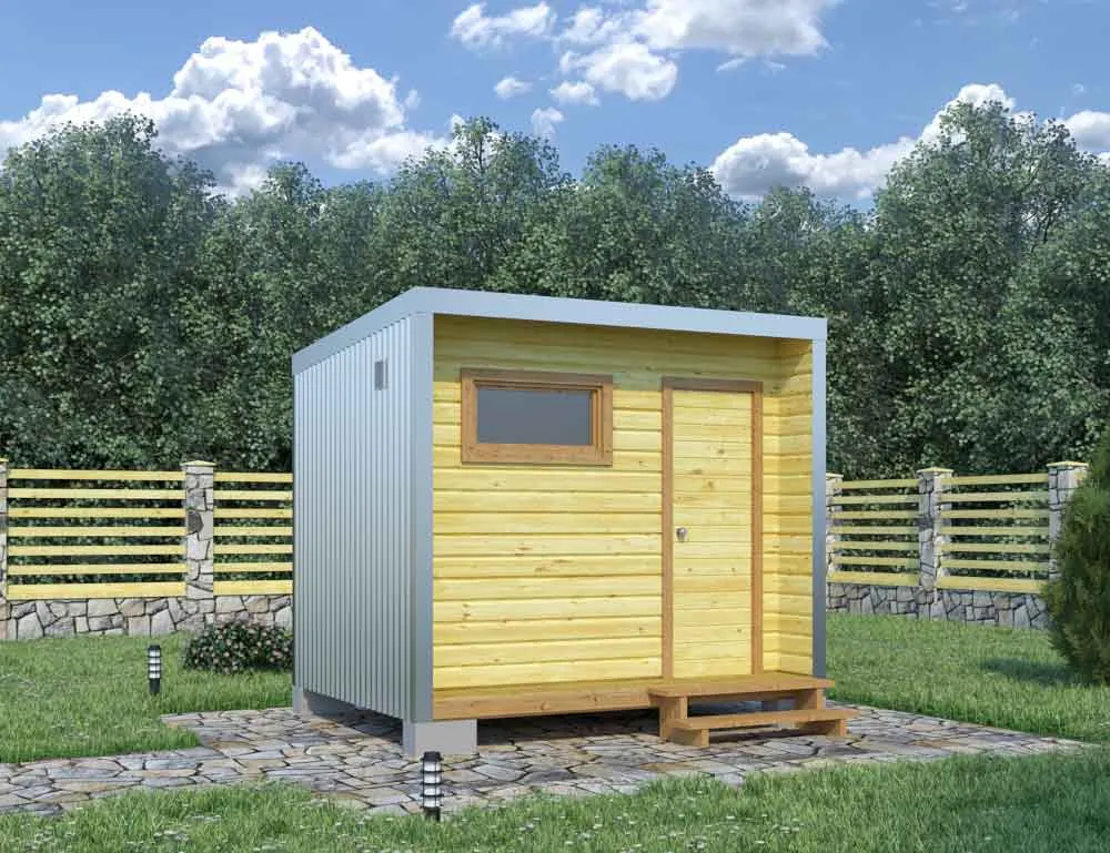 Бытовка для дачи в стиле хай-тек с цветным профлистом 3х2.43х2,47,2ДВП-Оргалит: